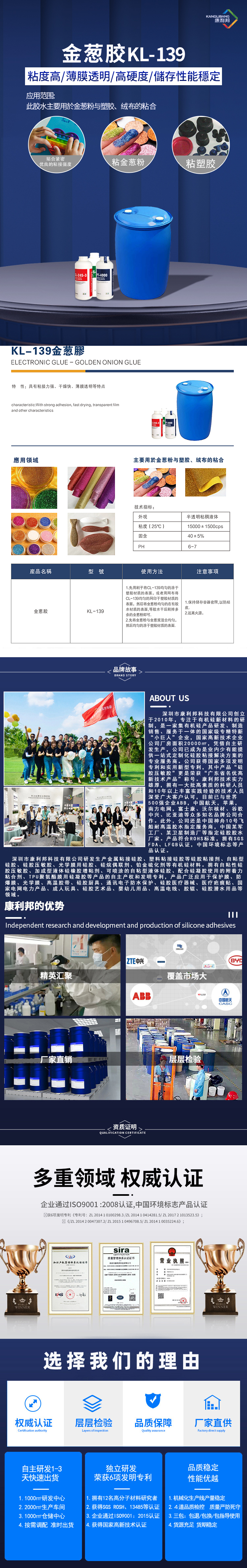 KL-139金蔥膠是用丙烯酸單體.用乳液聚合法(fǎ)聚合(hé)而成的強粘力乳液,具有粘度(dù)高、薄膜透明、高硬度、儲(chǔ)存性能穩定等優(yōu)良特性,耐熱性也優於其他白膠,KL-139金蔥膠應用範(fàn)圍廣,無毒環保,對皮(pí)膚無(wú)不良作(zuò)用。