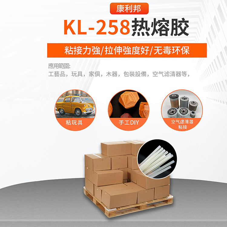 KL-258熱熔膠:本產品是由多種樹脂聚合而(ér)成,具有快幹、粘結力強、應用廣等特點,由於KL-258熱熔膠應用範圍廣泛,其用法的正確性和適用性,超出本公司管控範圍,因此(cǐ)使用者在使用之前需再做進一步的確認。