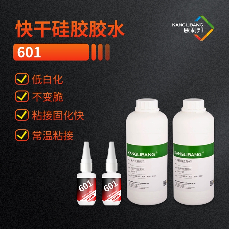 KANGLIBANG康利邦快幹矽(guī)膠膠水601是款快幹膠水,常(cháng)配(pèi)合矽膠處理劑K770係列,典型應用於矽膠(jiāo)粘金屬塑膠等領域(yù)。膠水粘接(jiē)隻需5-35秒,粘接(jiē)牢固、低白化、不變脆!
