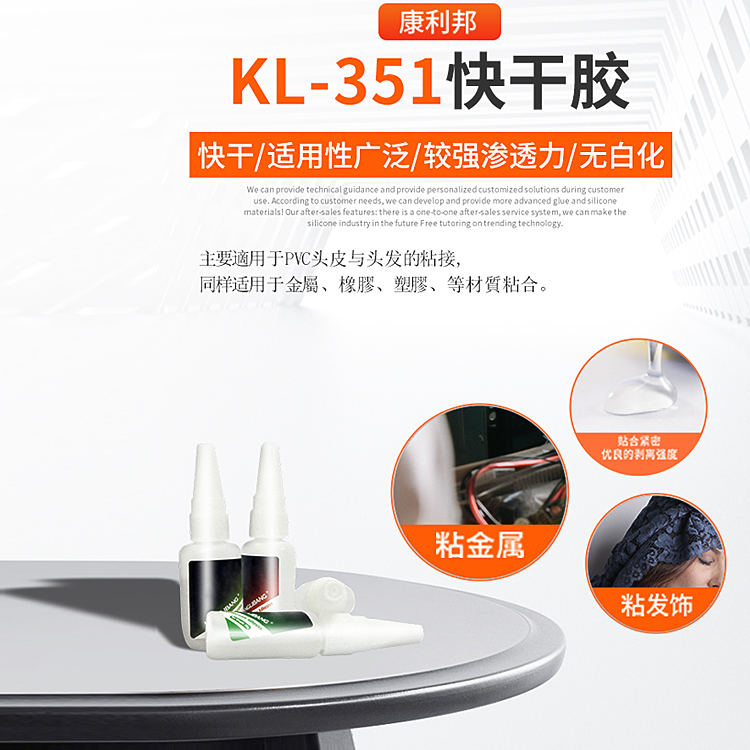 KL-351快幹膠是(shì)一種單組份的丙烯酸酯粘合劑, 它不(bú)用加熱(rè), 無需溶劑, 在室溫下快速固化,且粘合強度很高。由於KL-351快幹膠應用範圍(wéi)廣泛,其用法的正確性(xìng)和適用性,超出本公司管(guǎn)控(kòng)範(fàn)圍,因此使用者(zhě)在使用之前需再做進一步的確(què)認。